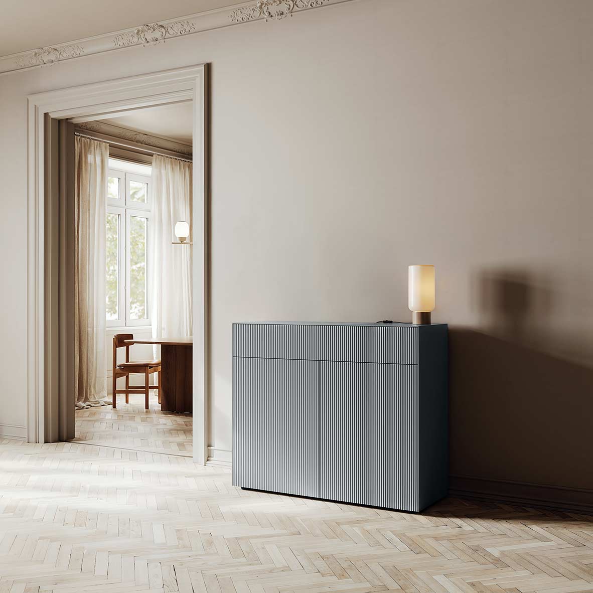 Finessenreich im Detail, präzise auf Gehrung gearbeitet und mit feinen Schattenfugen versehen, vereinen die Nex Pur Boxen hohe Variabilität mit zeitloser Gestaltung. Sie sind eine Auswahl der beliebtesten Einzelkommoden mit Türen, Schubladen oder Klappen.